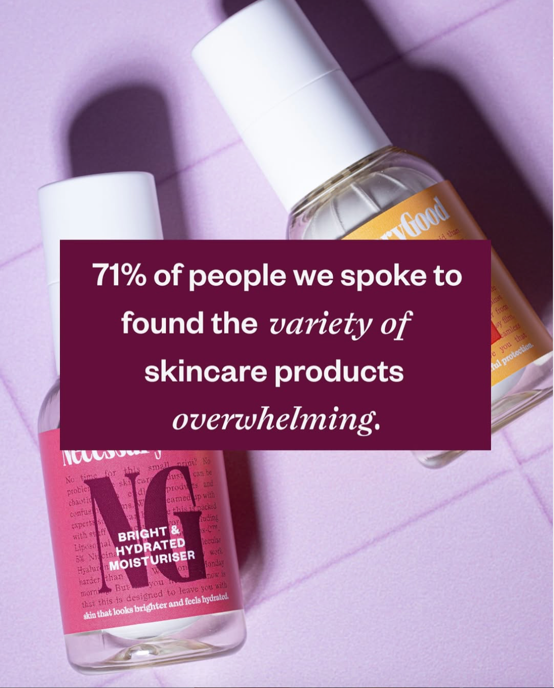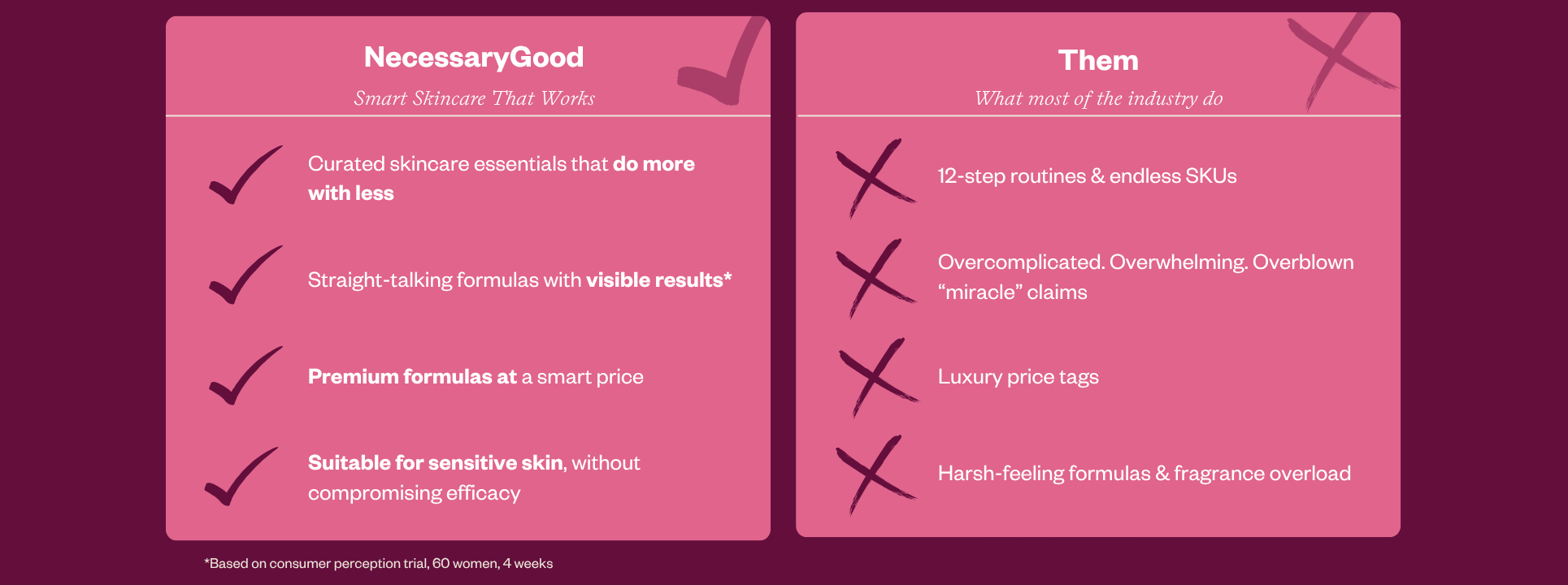 Ever stood in the skincare aisle, staring at 50 different creams, wondering what your skin actually needs? Or scrolled through endless product reviews, only to feel more confused than when you started? Us too. We believe great skin shouldn’t require a PhD, a 10-step routine, or half your salary. That’s why we created NecessaryGood—to bring you the best possible stuff for your skin, without the second guessing. So we teamed up with experts in white coats to pick the most effective, science-backed ingredients, and bottled them into a capsule collection of skincare essentials that do what they promise. Hydrating? Obviously. Brightening? You bet. Barrier-boosting? Of course. Confusing? Never. We don’t crank up percentages just to look impressive on a label. Our formulas are all about balance. Think of the perfect Espresso Martini—smooth, balanced, and made with great ingredients that work brilliantly together. When you take a sip, you just know—this is bloody good. Our skincare works—simple as. No overflowing shelves of products needed. Just hard working essentials that keep your skin healthy, hydrated, and protected, while fitting effortlessly into your life. And when you find skincare this good, wasting it isn’t an option. We use Innerbottle® technology, an airless balloon system that’s easy to recycle and collapses as you pump, making sure less than 1% of product gets left behind. Every drop goes where it belongs— on your skin. Our formulas? Smart, high-performance, and expertly curated. Our packaging? Thoughtfully designed and waste-free. Our approach? Effortlessly efficient: giving you the best ingredients, in the best formulas, without the fuss. Our people? Busy types who want great skin, but know skincare should fit into their life, not take over it. And when people start asking why your skin looks so damn good? Pass it on - easy, effective and enjoyable beauty is back. Yes to great skin. No to overthinking it. Ever stood in the skincare aisle, staring at 50 different creams, wondering what your skin actually needs? Or scrolled through endless product reviews, only to feel more confused than when you started? Us too. We believe great skin shouldn’t require a PhD, a 10-step routine, or half your salary. That’s why we created NecessaryGood—to bring you the best possible stuff for your skin, without the second guessing. So we teamed up with experts in white coats to pick the most effective, science-backed ingredients, and bottled them into a capsule collection of skincare essentials that do what they promise. Hydrating? Obviously. Brightening? You bet. Barrier-boosting? Of course. Confusing? Never. We don’t crank up percentages just to look impressive on a label. Our formulas are all about balance. Think of the perfect Espresso Martini—smooth, balanced, and made with great ingredients that work brilliantly together. When you take a sip, you just know—this is bloody good. Our skincare works—simple as. No overflowing shelves of products needed. Just hard working essentials that keep your skin healthy, hydrated, and protected, while fitting effortlessly into your life. And when you find skincare this good, wasting it isn’t an option. We use Innerbottle® technology, an airless balloon system that’s easy to recycle and collapses as you pump, making sure less than 1% of product gets left behind. Every drop goes where it belongs— on your skin. Our formulas? Smart, high-performance, and expertly curated. Our packaging? Thoughtfully designed and waste-free. Our approach? Effortlessly efficient: giving you the best ingredients, in the best formulas, without the fuss. Our people? Busy types who want great skin, but know skincare should fit into their life, not take over it. And when people start asking why your skin looks so damn good? Pass it on - easy, effective and enjoyable beauty is back. Yes to great skin. No to overthinking it.Ever stood in the skincare aisle, staring at 50 different creams, wondering what your skin actually needs? Or scrolled through endless product reviews, only to feel more confused than when you started? Us too. We believe great skin shouldn’t require a PhD, a 10-step routine, or half your salary. That’s why we created NecessaryGood—to bring you the best possible stuff for your skin, without the second guessing. So we teamed up with experts in white coats to pick the most effective, science-backed ingredients, and bottled them into a capsule collection of skincare essentials that do what they promise. Hydrating? Obviously. Brightening? You bet. Barrier-boosting? Of course. Confusing? Never. We don’t crank up percentages just to look impressive on a label. Our formulas are all about balance. Think of the perfect Espresso Martini—smooth, balanced, and made with great ingredients that work brilliantly together. When you take a sip, you just know—this is bloody good. Our skincare works—simple as. No overflowing shelves of products needed. Just hard working essentials that keep your skin healthy, hydrated, and protected, while fitting effortlessly into your life. And when you find skincare this good, wasting it isn’t an option. We use Innerbottle® technology, an airless balloon system that’s easy to recycle and collapses as you pump, making sure less than 1% of product gets left behind. Every drop goes where it belongs— on your skin. Our formulas? Smart, high-performance, and expertly curated. Our packaging? Thoughtfully designed and waste-free. Our approach? Effortlessly efficient: giving you the best ingredients, in the best formulas, without the fuss. Our people? Busy types who want great skin, but know skincare should fit into their life, not take over it. And when people start asking why your skin looks so damn good? Pass it on - easy, effective and enjoyable beauty is back. Yes to great skin. No to overthinking it.